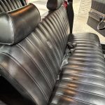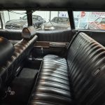 The spacious interior comfortably seats up to eight (or nine depending on configuration), featuring front and second-row bench seats upholstered in durable black vinyl, accented by warm woodgrain trim on the dashboard and door panels. The inward-facing third-row bench folds flush into the floor for maximum cargo flexibility — ideal for family hauling or weekend adventures. Amenities include power steering for easier maneuvering of the large body, while the seller notes the factory radio and clock are currently non-functional — typical age-related quirks on a survivor of this era.
