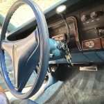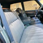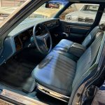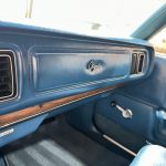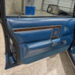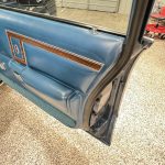 The expansive six-passenger interior exudes mid-1970s comfort, featuring front and rear bench seats upholstered in Medium Blue cloth and vinyl (trim code D7B6), accented by warm woodgrain trim on the dashboard and door panels. Fold-down armrests enhance front-seat luxury, while a comprehensive list of factory equipment includes air conditioning (manual temperature control, code H51), cruise control (N88), power door locks (P41), right remote-operated exterior mirror (G63), fender-top turn-signal repeaters (L31), and a solid-state AM/FM radio (R21). The padded steering wheel fronts straightforward analog instrumentation — a 100-mph speedometer flanked by ammeter, fuel level, and coolant temperature gauges — all presenting cleanly consistent with the car’s pampered history.