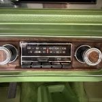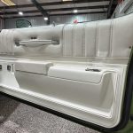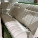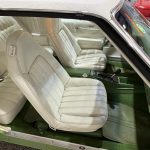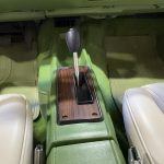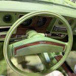 The interior features white vinyl upholstery on swiveling front bucket seats and full rear bench, green dashboard, center console, and carpets, plus woodgrain trim accents, push-button AM/FM radio, power windows, power door locks, automatic climate control elements, and a two-spoke steering wheel on a Comfortilt column framing basic gauges. Cabin provides generous space and a warm 1970s luxury atmosphere, with preservation reflecting moderate use and honest wear.
