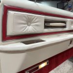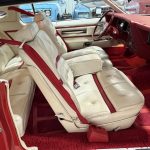 The luxurious interior features white leather upholstery with Lipstick Red accents on power-adjustable front seats, a full rear bench, deep-pile carpeting, automatic climate control, cruise control (integrated into the multifunction steering wheel), Quadrasonic AM/FM stereo, power windows and locks, and anti-fog glass. The dashboard includes a 120-mph speedometer and central fuel gauge; note the non-functional clock as a minor age-related item. The spacious cabin offers vast legroom, premium materials, and impressive preservation consistent with low mileage.
