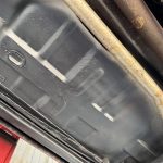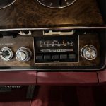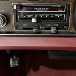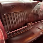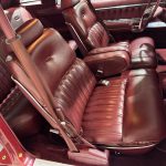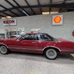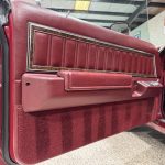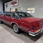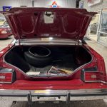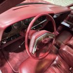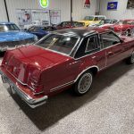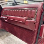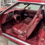Dark Red vinyl upholsters front and rear seats, with woodgrain trim on dashboard and door panels, power windows, cruise control, AM/FM stereo, air conditioning, and tilt steering column. Cabin is spacious and well-preserved; clock non-functional, but overall honest low-mileage condition.