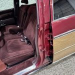 This 1988 Chevrolet Caprice Classic Estate Wagon is finished in Dark Maroon Metallic with woodgrain paneling, featuring 15″ steel wheels with wire-style covers and Hankook Optimo H724 tires — classic late-1980s full-size family wagon styling with practical three-row seating and cargo space. Power-assisted front disc/rear drum brakes and power steering ensure smooth handling; front-right bumper filler shows a crack, with touch-up paint and peeling woodgrain appliqué on the left side noted.