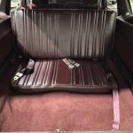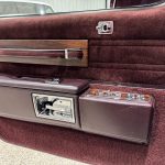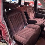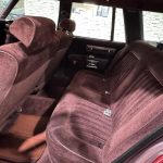 Maroon cloth trims first- and second-row bench seats plus rear-facing third-row bench, with AM/FM cassette radio, cruise control, air conditioning, Twilight Sentinel headlights, and basic instrumentation (85-mph speedometer, auxiliary gauges). Cabin is spacious and well-preserved for the mileage.